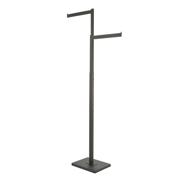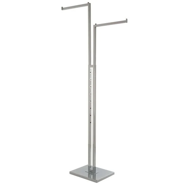 Showcase your best merchandise in style! With arms that independently adjust at each 3" increment between 48" - 72", you can show off anything from children's clothing to long women's' dresses. It's frame and legs are composed of 1" square tubing with adjustable levers already included.