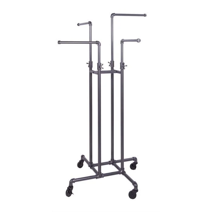 Showcase your best floor merchandise that every retailer wants with Econoco's Pipeline Collection. Two 60" hangrails can be raised or lowered independently from 53" - 80" with a base occupying a 48" x 22" footprint. Great for hanging two different types of merchandise, such as dresses and jackets. Made from 1 14" plumbing pipe, finished with a durable epoxy coating in a modern, anthracite gray. Includes four 3" casters; (2 of them being lockable).