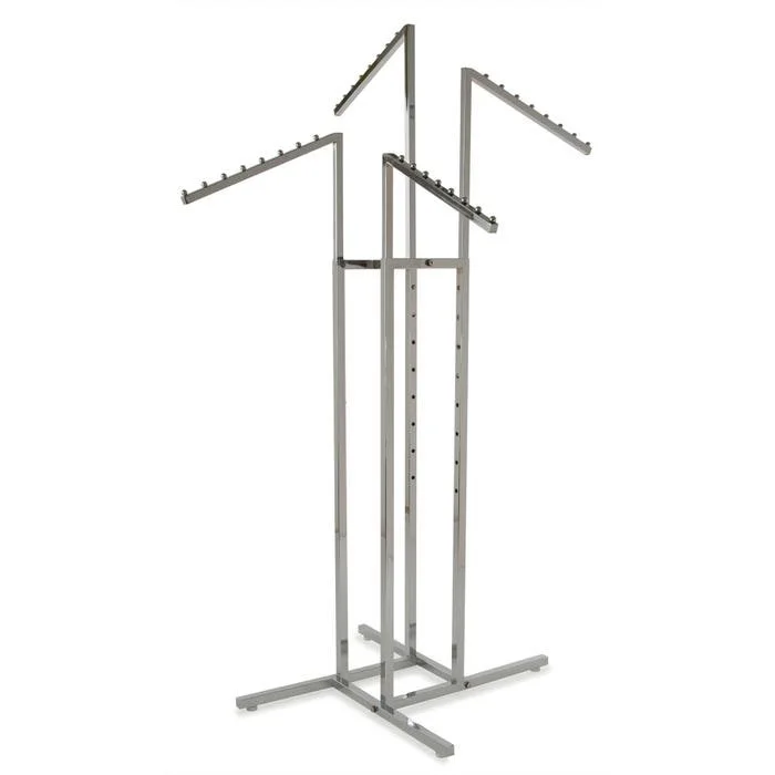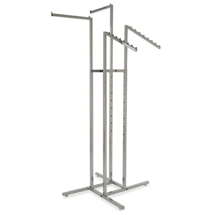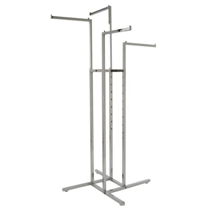 Looking for something dynamic for your retail store? This 4-way clothing rack has arms that independently adjust at every 3" increment between 48" - 72", so you can showcase anything from children's clothing to long women's dresses with ease. The frame and legs are made of 1" square tubing. Adjustable levers already included.