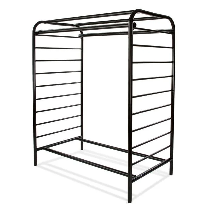 Our Double Center Floor Rack will extend your selling floor options. The unit measures 25" D x 48" L; its double hangrail system allows retailers to hang a full eight feet of merchandise within a compact space. The floor rack is constructed from 1¼" round tubing and has been finished with a durable semi-gloss black epoxy. Our Double Center Floor Rack may be additionally accessorized with hooks, faceouts, and baskets (cold separately) for cross-sells and to merchandise more inventory. The unit is shipped knocked down to save on freight costs. Assembly is quick and easy.